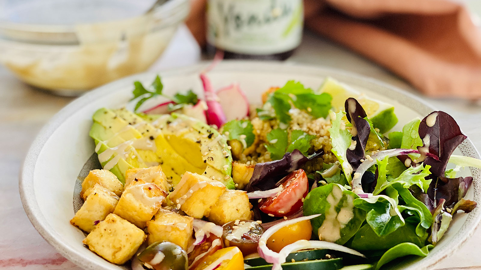 - Armar el bowl: En un plato hondo coloca una base de quinoa, agrega tus verduras frescas y acomoda el tofu horneado encima. Finaliza con el aderezo de tahini.